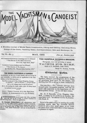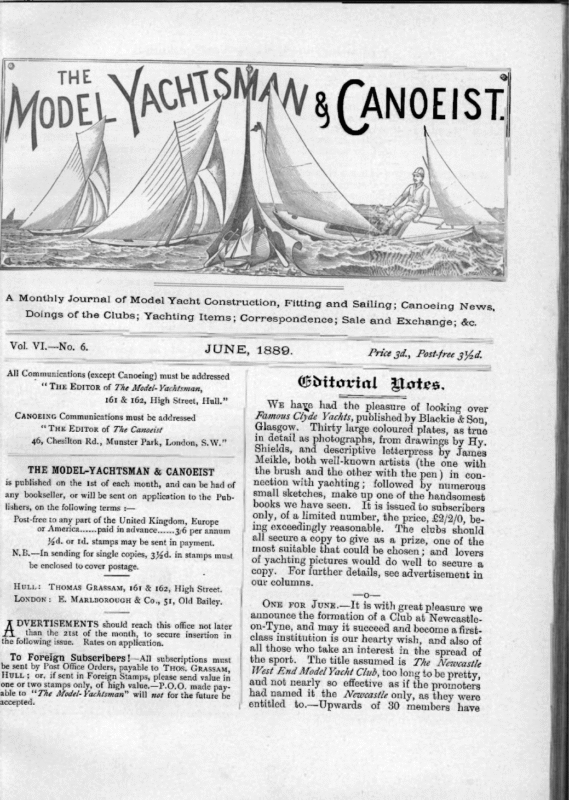 CANOEIST —— —_ Ns <= bo ne F/” WCgek * . ta “ —— A Monthly Journal of Model Yacht Construction, Fitting and Sailing; Canoeing News, Doings of the Clubs; Yachting Items; Correspondence; Sale and Exchange; &e. Vol. VI.—No. 6, JUNE, All Communications (except Canoeing) must be addressed ‘THE EpItoR of The Modei- Vachtsman, 161 & 162, High Street, Hull.” | & CANOEIST RIE | pay N.B.—In sending for single copies, 3%d. in stamps must E. MARLBOROUGH & Co.,, 51, Old Bailey. : DVERTISEMENTS should reach this office not later A than the 21st of the month, to secure insertion in the following issue. Rates on application. To Foreign Subseribers!—All subscriptions must be sent by Post Office Orders, payable to THos, GRassa , HULL; or, if sent in Foreign Stamps, please send value in one or two stamps only, of high value.—P.O.O. made pay- able to “The Model-Yachtsman” will net for the future be accepted. other with (the one with the pen) by in con- numerous sino ne Ing exceedingly reasonable, all secure a copy to give as The clubs should a prize, one of the most suitable that could be chosen; and lovers of yachting pictures would : THomas Grassam, 161 & 162, High Street. Lonpon: the only, of a limited number, the price, £2/2/0, be- or America..,... paid in advance...... 3/6 per annum PG LTE HuLL: and re He tian Rea 7. og wee Post-free to any part of the United Kingdom, Europe SOP brush nection with yachting; followed lishers, on the following terms :— be enclosed to cover postage. Shields, and descriptive letterpress by James the any bookseller, or will be sent on application to the Pub- ee Glasgow. Thirty large coloured plates, as true in detail as photographs, from drawings by Hy. Meikle, both well-known artists is published on the Ist of each month, and can be had of o ~ Uotes, We haye had the pleasure of looking over “THE EDITor of The Canoeist “ad. of Gditor ial Famous Clyde Yachts, published by Blacki e & Son, 46, Chesilton Rd., Munster Park, London, S.W.” MODEL-YACHTSMAN Price 3., Post-free 30d. ‘ | CANOEING Communications must be addressed THE 1889. copy. do well to secure a For further details, see advertisem ent in our columns, | Oni For Juxz.—It is with great pleasure we oe announce the formation of a Club at Neweastle- on-Tyne, and may it succeed and become afirst- lags institution ia our hearty wish, and also of all those who take an interest in the spread of | the sport. The title assumed is Zhe Newcastle West End Model Vacht Club, too long to be pretty, and not nearly had named entitled it so the effective as if the promoters Aewcastle onl to.—Upwards as th ys ey were of 30 members have 102 THE MODEL-YACHTSMAN already joined, some having models, and many have commenced to build 10-tonners.—The fol- | lowing are the officers elected :—President, Ald. Newton; Commodore, D. F. Black; Vice-Com., J. Sutton; Captain, E. Davison; Treasurer, W. Black; Committee, Messrs. Harris, Mathieson, Jones, Fleming and Wright; Secretary, P. Me. Gill, 19, Hamsterley Road, Neweastle-on-Tyne. —_0-— We congratulate the Dundee club on their continued prosperity, and more especially on their good fortune in having great improvements made at their sailing pond, the Magistrates haying made it a first-class place for model sailing. The Dundee club have adopted the plan of rating their boats by weight or displacement, and find it a very satisfactory plan, insuring a good and reliable type of boat, which closely approach each other in style and measurement, and does not lead in their experience to extremes. -——O— We have been favoured with copy of Rules and season’s programme of the Kingstown club. The first short and to the point, the latter full of fixtures promising good sport. 9 Inrer-oLus Matcu.—Aingston (Hull) v. Scar- boro’.—On May 4th, the clubs met at Scarboro’ and sailed a 10-ton match. 13 models from Hull and 20 belonging to Scarboro’ competed. The fixture unfortunately was not favoured with a reliable breeze, as the Scarboro sailing ground is situated in a beautiful valley, and in the direction from which the wind prevailed is shaded by high rising ground, which, adding attractiveness to the scene, yet spoiled the course of the wind, and consequently the sailing. In spite of this, however, merriment and good spirits prevailed amongst all, and all having to take the puffs of fortune good or ill alike, they rowed in the same boat and enjoyed the outing immensely. The Scarboro club behaved most attentively and handsomely, providing means of transport for models and owners to and from the Railway Station, and this first match in the Searboro’ water will no doubt lead to further friendship and competition between the two clubs. Want of space forbids a detailed description, but after many a vicissitude and fantastic breeze had changed the tide of fortune to one side or the other, the Scarboro’ club more than held their own. The 1st prize, a handsome marine picture painted and presented by Mr, Albert Strange, Vice-com. Scarboro’ Club, was won by ‘Ida,’ Mr. R. Simpson, (Scarboro’). Second prize given by the Scarboro’ club, was won by ‘Cassandra,’ Mr. N.H. Skow, (Kingston), and 3rd prize, the same donors was won by the ‘Albatross’, Mr. R. Cole, (Scarboro.) AND CANOEIST Doings of the Chris. Reports for publication must be legibly written, on one side of the paper ox/y, and forwarded to the EpIror not later than the zoth of each month, to ensure insertion in the following issue. Glasgow M. ¥. C.—The club held their first regatta this season on Saturday, May 4th. There were only four entries, and with wind light and variable, a start was made at 5 p.m. ‘Blue Bell’ led the way, closely followed by ‘Sea King,’ while ‘Thistle’ and ‘Albatross’ fouled at start. The two latter having been separated and put about, ‘Albatross’ stood straight for the flags, followed by ‘Thistle’ which shortly drew ahead of her