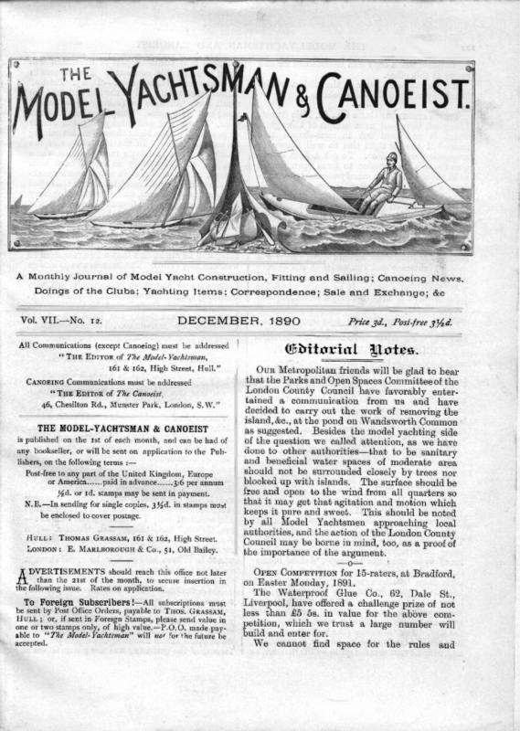 A Monthly Journal of Model Yacht Construction, Fitting and Sailing; Canoeing News, Doings of the Clubs; Yachting Items; Correspondence; Sale and Exchange; &e Vol. VII.—No. DECEMBER, r2. All Communications (except Canoeing) must be addressed 161 & 162, High Street, Hull.” CANOEING Communications must be addressed “THE EDIToR of The Canoe?s?, 46, Chesilton Rd., Munster Park, London, S,W.” THE MODEL-YACHTSMAN & CANOEIST is published on the rst of each month, and can be had of any bookseller, or will be sent on application to the Pub- | Post-free to any part of the United Kingdom, Europe or Ameriea…… paid in advance….., 3/6 per annum Jd. or Id. stamps may be sent in payment. N,B,—In sending for single copies, 344d. in stamps must be enclosed to cover postage. HULL: THOMAS GRASSAM, I61 & 162, High Street. LONDON: E. MaRLBoroucGu & Co., §1, Old Bailey. DVERTISEMENTS should reach this office not Jater than the 2ist of the month, to secure insertion in the following issue. Kates on application, To Foreign Subseribers!—All subscriptions must be sent by Post Office Orders, payable to THos. GRASSAM, HULL; or, if sent in Foreign Stamps, please send value in one or two stamps only, of high value.—P.O.O. made payable to “*7he Model- Vachtsman” will not for the future be accepted. Price 3@., Post-free 7%¥%d. Gditorial “THE Epiror of 7he Afodel- Yachisman, lishers, on the following terms :— 1890 Uotes. Our Metropolitan friends will be glad to hear that the Parks and Open Spaces Committee of the London County Council have favorably entertained a communication from us and have decided to carry out the work of removing the island, &¢., at the pond on Wandsworth Common as suggested. Besides the model yachting side of the question we called attention, as we have done to other authorities—that to be sanitary and beneficial water spaces of moderate area should not be surrounded closely by trees nor blocked up with islands. The surface should be iree and open to the wind from all quarters so that it may get that agitation and motion which keeps it pure and sweet. This should be noted by all Model Yachtsmen approaching local authorities, and the action of the London County Council may be borne in mind, too, as a proof of the importance of the argument. OPEN Competition for 15-raters, at Bradford, on Haster Monday, 1891. The Waterproof Glue Co., 62, Dale St., Liverpool, have offered a challenge prize of not less than £5 5s. in value for the above competition, which we trust a large number will build and enter for. We cannot find space for the rules and 222 THE MODEL-YACHTSMAN regulations, but a copy can be obtained for one penny at this office. Mr. Richardson’s letter on the subject will be found in our correspondence column. . —oO— THe WATERPROOF GLUE Co., 62, Dale Street, Liverpool, have sent us a sample of their glue, which is now sent out in cone-shaped tins instead of the air tight tins so well known in connection with paints. To get a dose of the glue there is no occasion to foree open the lid as in the old tin: itis merely necessary to with- draw a small pin and handle the tin in much the same fashion as the small oil feeders; a little pressure on the bottom sends out the required quantity of glue, when the pin is again inserted and the contents are kept as tight as if bottled up. The fault of the old tin was that after usage a few times it fouled at the lid and became no longer an airtight case. Now the model yachtsman and the amateur can be sure of fiuding this handy friend has not deteriorated with time, and that he is as ready to trickle forth in small or large quantity after he has been on the shelf some time as he was when first bought. LIVERPOOL AND SOUTHPORT MODEL YACHT CLUB CHALLENGE CUP. The second race for the above cup (length and sail area 20 rating) took place on the Marine Lake, at Southport, on Thursday, 23rd October, and although the entries for the trophy were not so good as expected, still the way the various boats sailed their heats inade up for the paucity of competitors. The heats were sailed as below : ‘Daisy,’ Mr. T. Case Morris, L.M.Y.C. ‘Windermere, My, John Ellis, 8.M.Y.C. ‘Aziola,’ Myr. John Hall, M.M.Y.C. ‘Olive,’ Mr. Bibly, 8.M.Y.C. ‘Thistle,’ The Messrs. Bower, L.M.Y.C. ‘Elaine, Mr. F. N. Darbyshire, L.M.Y.C. ‘Mystery,’ Mr. John Holforce, 5.M.Y.C. ‘‘Atheling,’ Mr. W. H. Dreaper, 8.M.Y.C. ‘Advance,’ Mr. Andrew Crawford, L.M.Y.C. ‘Lezare, Mr. Holbrook Gaskell, L.M.Y.C. The heats were won by ‘Daisy,’ ‘Aziola,’ (‘Olive being thrown out, as on being measured was found to be over the tonnage), ‘Aziola’ in consequence being given the race, ‘Thistle’ (in good style from ‘Hlaine’), whilst ‘Adtheling’ in 4th heat made quite an example of ‘Mystery,’ the latter not being able to sail the course, indeed she never once went through the flags, and something seemed radically wrong with her all the day. The ‘Advance’ (the holder of the eup) beat the ‘Lezare’ in the 5th heat, in easy fashion, and which event created quite an excitement, as | AND CANOEIST it looked as if the latter part of the match was going to be toughly contested. The winners in the 2nd course of heats were :—‘Daisy,’ ‘Thistle,’ ‘Aziola,’ ‘Advance’; and in the 8rd and final the result was: ‘Advance’ lst (taking cup for second time) and first prize, ‘Daisy’ 2nd and second prize, ‘Thistle’ 3rd and third prize; the winner on passing the flags being cheered on his gaining his second victory. In the blue ribbon of the Southport Lake the day’s racing on the whole was not so satisfactory as might have been desired, as the wind was in a bad quarter making the course a broad reach instead of the hoped for beat to windward, and thus favoring very much the long and flat floored ‘Advance,’ it was not so much due to her speed but to her steady sailing on the long reach (500 yards) that secu