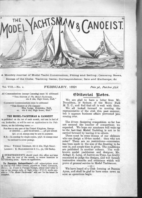 —_ — (ANOEIST, A Monthly Journal of Model Yacht Construction, Fitting and Sailing; Canoeing News, Doings of the Clubs; Yachting Items; Correspondence; Sale and Exchange; &e Vol, VIIL—No, FEBRUARY, 2. 1891 All Communications (except Canoeing) must be addressed Goviterial THE Epitor of 7he Model- Yachtsiman, 161 & 162, High Street, Huil.”’ Canocinc Communications must be addressed “THE Epitor of Zhe Canoetst. Elim Lodge. Hornsea, Hull, or, 161 & 162, High Street, Hull.” THE MODEL-YACHTSMAN & CANOEIST Price 3@., Post-free 2¥ed. _ We are glad to have a letter from Mr. Donaldson, of Sydney, of the Moore Park M. Y. C., and find that all is well with them. We all looked lishers, on the following terms :— Post-free to any part of the United Kingdom, Europe or America…… paid in advance…… 3/6 per annum 14d. or Id. stamps may be sent in payment. N.B.—In sending for single copies, 344d. in stamps must be enclosed to cover postage. HULL: THOMAS GRASSAM, 161 & 162, High Street. LONDON: E, MARLBOROUGH & Co., 51, Old Bailey. DVERTISEMENTS should reach this office not later than the 23st of the month, to secure insertion in the following issue. Rates on application, To Foreign Subseribers!—All subscriptions must be sent by Post Office Orders, payable to THos. GRassAM, HvuLi; or, if sent in Foreign Stamps, please send value in one or two stamps only, of high value.-—P.O.O. made payable to ‘‘7he Afodel- Yachtsman” will not for the future be accepted. forward representative of the club to this meeting the past summer, but it appears business affairs prevented bim colning over. is published on the Ist of each month, and can be had of any bookseller, or will be sent on application to the Pub- Wotes. —_O-—_ The 10-ton designing competition so far has not secured expected. the number of competitors we We hope our amateurs will wake up to the fact that Model Yachting is not to be carried forward by leaving it to others. There must be some dozens of our clubmen who can design a 10-ton model: then why not enter? There are no restrictions—concession has been made in the size of the drawing to be sent in, and ample time is given, The conditions are published in another column. The wellknown model yachtsman and designer, Mr. Ardagh HK. Long, of Jarrow-on-Tyne, has kindly consented to judge the designs, and will furnish instructive remarks and criticisms which will prove of general service to Model Yachtsmen. WE have heard of a Club forming at Buenos Ayres, and shall be glad to have some news as. soon as operations begin, THE MODEL-YACHTSMAN 22 It was our intention to print the rules of the 16-raters on a for Bradford competition The demand was not great separate form. enough, so we published them in last month’s issue of Afodel Yachtsman and Canoetst. Correspondents please note, A CoRRESPONDENT is desirous of helping to Cannot some of the form a Club at Blackpool. nearest clubs do something to assist? Address: Mr. 8. G. Radeliffe, 44, White Gate Lane, Blackpool. A CorRESPONDENT hopes the designing competition will lead to the publication of some designs of well-known first-class racing models, and we hope so to. JORRAWITE.—Writes commending ‘Red and We Green” for his reply to Lieut. Middleton. cannot publish the letter in extenso, but thank him for good wishes. OUR DESIGNING COMPETITION. Competition FoR Dzsians for 10-tonner 1730 rule. The winning designs to be published in the Model Yachtsman. First prize, a well-finished model built to the successful design. Second prize, one guinea. Intending competitors should send a notification of their intention to compete, to this office. Designs can be half-size, deck and sheer-plans, and full size body-plan. Each design must be marked with a device or motto, and they will be sent all in one parcel te the judge by us. All designs must be in by March 3rd. “TUMBLE HOME.” THE Evitor, Model-Vachtsman., In furtherance of J. M’s advocacy of ‘‘ Tumbling Home Topsides,” I should like to add the following : Steadiness in sailing being an important factor to success in matches, any form which tends to this end should be studied. Tumble home, or the rounding in of the free-board from the load line, conduees, in a degree, to this steadiness in sailing, but more so, if the midship section from the load line downwards, has a curve assimilating in a portion of its depth to that of the free-board, for an equal height aéove the load or water line. By this treatment of the form aéove and below the waterline, the yacht when heeled to, say 10 degrees has a line of immersion very little distorted from that of the original or upright position. It will be readily understood, without a scientific AND CANOEIST investigation how this form assys¢s in preserving or maintaining the original balance of the various centres, Let any of your readers who imay be interested in the subject carefully note the exact form of the water line of a boat (with bulky free-board and much cut away below) when she is pressed to the gunwale, and again when she is upright, and the contrast of the respective lines of flotation cannot fail to elucidate the significance of a free-board in keeping with the character of the boat. These remarks have special reference to steady sailing in model yachts, but real yachts being under control cannot afford to sacrifice the power which is lost by narrowing the topsides, the curve or range of stability is shortened, and the sail-carrying power lessened. Guernsey, 15th January, 1891. Yours truly, R. H. ERRATA. TumBiing Home Toprsipzs.—In this article, published last month, the words, ‘‘of all inward form” in the last line but one, in first column, should be #o fall tnward from. the Clubs. Doings of Reports for publication must be legibly written, on one side of the paper oz/y, and forwarded to the Epiror not later than the 20th of each month, to ensure insertion in the following issue. George M. Y.C. ( London J—Th