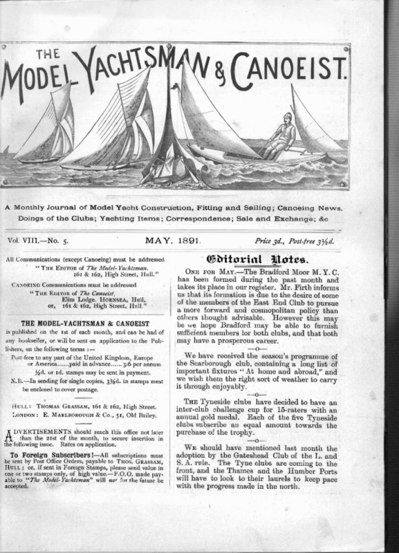 The Model Yachtsman and Canoeist: Volume 8, Issue 5 – May 1891May 15, 1891Archives, The Model Yachtsman and Canoeist Scan provided by the Albert Strange Association. Title. Author. SummaryTitle. Author. SummaryTitle. Author. SummaryTitle. Author. SummaryTitle. Author. Summary be belayed at the cleat is passed to the end. Being knotted it cannot get away, and you always know where to put your hand on each of your ropes. Up to the present time I have always used brass jam cleats, but this season I am going to see if oak will not be better. “The cleat shown April Supplement. is similar to No. 7 shown in the THE CANOE “SEVERN.” This canoe, of which we this month give the lines, was designed in 1889, by Mr. Walter Stewart, of the ‘‘ Charm,” as a fast cruiser. She was intende d to carry a ‘crew’ of to or 11 stones weight and 8olbs. of duffle. In her first cruise from Oxford to London she carried two men and their camping gear, sailing with 75ft. cruising rig. Mr. Holding, her late owner, writes of her—“She was raced at “most of the R.C.C. fixtures in the year 89. ‘Though a fast boat, her performances on Hendon “Lake were not marked by success. She is not ‘and can never be a good boat to windward, but “in running I know nothing faster. In sailing ‘with a beam wind she was amongst the fastest, “but as most of the racing that season was a dead “beat up and a run down this placed her at a 98 _ THE MODEL-YACHTSMAN AND CANOKEIST. “disadvantage. At the R. C. C. regatta she entered “in four races, taking one first and three second across the masts, and then, in the dark, went ashore across two other craft to prospect for a “orizes, kipper. Again at the regatta last year she “com peted in three events, taking one first prize. “The boat’s sensitiveness under way was remark“able, whilst in coming about it was rarely “necessary to put the rudder over as she spun “round directly the tiller was let go. It isan “open question whether sails abaft the mast or “lugsails are best for boats of this peculiar model. “In competing with the sailing gigs of the ‘Ranelagh Sailing Club in two races where we “chiefly had a beam wind she took a prize in the “first race, failing in the next by only six seconds “‘thro’ being detained nearly two minutes by a “foul caused by the bowsprit of the following boat “hooking into the reef lines of the Severn’s mizen. ‘The weight of the hull is 120lbs., centreplate 30 ibs., drop-rudder 7lbs. She has also a light centre plate for cruising, weighing 8lbs. ‘This season the “Severn” is owned by Mr. G. E Webster, and under the name of “Stella” willbe raced at Hendon under lug-sails—so that the question of abaft-the- mast sails versus lug-sails is likely to be brought nearer to a practical solution, TABLE ££ 2 OF 8 OFFSETS 4 Freeboard…92 72 68 6 Draught ..8 5 od 6 4-bdth Deck8$ 124 142 15 , ~~»: BE 194 144 15 8…72 » ” 4,..54 ” 5..0 Sec. Areas.16.5 12 142 104 183 5£ 94 61 92.5 152 15 11f 108 86 6 7 8 65 74 84 52 4 3 148138410 10% 0 14 15 132 10 142 128 84 10 68 0 100 74.5 24 3 0 0 142 138 102 0 0 Stations spaced 223:n apart ” ,, 3in Waterlines ,, Buttocklines ,, 32in Overhang, forward lin, aft lin Displacement, 380lbs LINES FROM A _ 17-FOOTER. August 14th. Blyth, 10-30 p.m. Left Cullercoats, with close reefed mainsail only, at 6.15 p.m. Wind W, and brisk, sea flat, with long, low roll from northward. Not so much wind as I imagined, so almost at once spread whole mizen, and spanked along delightfully. But the wind lost strength all the way, and was quite mild when I got near to Blyth. I had to lie pretty near the wind, and had the flood tide against me throughout—and it runs south here at near three knots an hour—nevertheless I did the measured mile in seventeen minutes, I am satisfied that she is a fast boat. She behaved very well indeed. I got to Blyth at 7.55, just at the top of the tide. Found a berth alongside a small steam yacht, to which Iam moored head and stern. I stowed the sails, and lashed main spars Returning, I put up tent and lit lamp. ‘The tent is simply capital. It fits first go off, and the ties, substituted for the proposed buttons on deck, The tent up, I are most successful. teil commenced the first fry of the cruise, and managed to cook the kipper to perfection. This over, I made some tea and “ washed it down” with bread and butter. Now I am writing to you and splicing the main brace, and you will get this, I hope, to-morrow afternoon, The cabin looks really jolly from here. It would make chortle. The lockers are shut up; the water keg stands beside me on the other side the centreboard; storm sail, mop, top boots, &c., occupy the same side; anchors and cables stuff the forehold ; a blanket covers my legs as | half lie on the air bags, and the famous lamp hangs overhead. The bows of a big steamer overshadow me within biscuit throw, and all is perfectly still, so I shall turn in almost immediately, My face is already smarting with salt (and dirt perhaps, for you cannot use soap in salt water), and I am as warm asa toast, and expect to sleep well the first night. There was a fine red sunset and things promise well for to-morrow. August 16th. Newbiggin. My history since To begin exactly where I left offI had wot a good night, in spite of my prophesy. The steamer I spoke of had holed herself against a dredger very shortly before I came into the river, and shipplaters were at work through the night—hammer, hammer, hammer—to get her ready for next evening’s tide, when her cargo of coal would be on board. I was also the outside boat of the tier, and every vessel that went in or out, though moving slowly, made waves that sent me bump against the steam yacht. However, I did sleep until four a.m., and then watched the platers at work. I never in my life saw a man work so hard as the fellow who was chiefly engaged. ‘There he was, on a couple of planks slung 