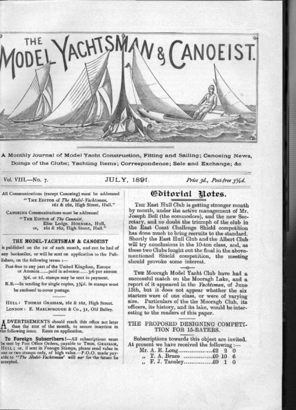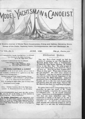 —— 3 (ANOEIST A Monthly Journal of Model Yacht Construction, Fitting and Sailing; Canoeing News, Doings of the Clubs; Yachting Items; Correspondence; Sale and Exchange; &c Vol. VIII.—No. 7. JULY, 1891. G@oditorvial All Communications (except Canoeing) must be addressed **THE Epitror of Zhe Model- Yachtsman, 161 & 162, High Street, Hull.” CANOEING Communications must be addressed ** THE Epitor of The Canoeist, Elim Lodge. Hornsga, Hull, or, 161 & 162, High Street, Hull.” THE MODEL-YACHTSMAN & CANOEIST is published on the 1st of each month, and can be had of any bookseller, or will be sent on application to the Publishers, on the following terms :— Post-free to any part of the United Kingdom, Europe or America…… paid in advance…… 3/6 per annum ¥d. or Id. stamps may be sent in payment. N.B.—-In sending for single copies, 344d. in stamps must be enciosed to cover postage. Hutt: Tuomas GrassaAm, 161 & 162, High Street. LONDON: E. MARLBOROUGH & Co., 51, Old Bailey. DVERTISEMENTS should reach this office not later than the 2Ist of the month, to secure insertion in the following issue. Rates on application. To Foreign Subseribers!—All subscriptions must be sent by Post Office Orders, payable to THos. GRASSAM, HULL; or, if sent in Foreign Stamps, please send value in one or two stamps only, of high value.—P.O.O. made payable to ‘The Model-Yachtsman’ will no* for the future be accepted. Price 34., Post-free zed. Uotes. Tue Hast Hull Club is getting stronger month by month, under the active management of Mr, Joseph Bell (the commodore), and the new Secretary, and no doubt the triumph of the club in the East Coast Challenge Shield competition has done much to bring recruits to the standard. Shortly the Hast Hull Club and the Albert Club will try conclusions in the 10-ton class, and, as these two Clubs fought out the final in the abovementioned Shield competition, the meeting should provoke some interest, —— THE Mooragh Model Yacht Club have had a successful match on the Mooragh Lake, and a report of it appeared in the Vachtsman, of June 13th, but it does not appear whether the six starters were of one class, or were of varying size. Particulars of the the Mooragh Club, its officers, its history, and its lake, would be interesting to the readers of this paper. THE PROPOSED DESIGNING COMPETITION FOR 15-RATERS. Subseriptions towards this object are invited. At present we have received the following :— eae £2 2 0 » L. A. Bruce » EF. J. Tansley……u…… £0 1 0 THE 122 MODEL-YACHTSMAN The conditions suggested by Mr. Long are as follows :— The competition to take place about Septr. The Ist prize to be a model built from the successful design; 2nd prize, a book or books on yachting. The builder of prize to be selected by ballot of the subscribers. Subscribers as well as others would be eligible to compete. AND CANOEIST ‘Marian’. The second class race was called at 2 p.m. only two yachts starting, ‘May’ owned by Mr. Fisher, and ‘Kate C.’ owned by Mr. Sheridan. ‘Kate C.’ crossed the line at 12-0-12, taking the lead, ‘May’ crossed 8 secs. later. A close race followed, ‘May’ taking the lead at about onefifth of the course. She would undoubtedly have won this heat, but her main sheet slacked away The designs must be original; the length, beam, extreme draught and displacement would have to be stated, and the intended name of the flags. vessel onLy attached to the drawings. everything drawing. We would recommend our readers to send in their subscriptions at once, as the sooner we can announce the completion of the scheme the better. In the second heat ‘ Kate C.’ was handled to perfection, crossing the line a winner of the prize making the fast time of 8-56 elapsed, winning by 244 sec. corrected time, elapsed time of ‘May’ being 9m. 20s. Scrub races wound up the day’s sport.— Forest & Stream, Jane 4th, 1891. AMERICAN MODEL YACHT CLUB. The American Model Yacht Club of Brooklyn, N.Y., is now working hard for the encouragement of model-yacht sailing, a sport that has declined of late years about New York, though at one time in quite a flourishing condition. Prospect Park, Brooklyn, has long been the center of the sport, and the American M.Y.C. has its station there. The club was re-organized in 1887, and is now ina very satisfactory condition. present officers are:—Com., W. V. Vice-Com., G. W. Lyon; The Hanson; Treas., G. W. Town- ley; Sec., Harry Melvin; Meas., F. Nichols.— The yachts must not be under 30in. l.w.lL., fixed ballast is compulsory, und the total weight of yachts with largest set of sails must be registered, and the registered weight declared previous to a race. There are three classes; 53 to 68in. lw.L, 42 to 58in., and 30 to 42in. The allowance is 5d seconds per inch. The races are sailed to windward, the course being 3/10 of a mile. The first race of the year was sailed on Saturday, the first heat of the third class yachts being called at 11 a.m., the first yacht crossing the line at 11-10-13 as a fresh 5.5.W. wind sprung up. Six new yachts and one a year old started, their lengths averaging 404in. on l.w.1. The last year’s boat, ‘Electra’ was looked upon as a sure winner, she being tuned up much better than the newer boats. She made the fastest time in the second heat of the race, making the three-tenths of a mile in llm. 25s. in three legs, beating ‘Star’ on elapsed time by 24 sees., but being beaten by ‘Star’ on corrected time by 4sec., rather close sailing, with the other boats strung out. ‘Electra’ did not do so well in the other heats, but Mr. Scott’s new cutter ‘Marian’ showed up as well as can be expected of a new yacht, and there is no doubt that the future races of the season will be between ‘Hlectra,’ ‘Star,’ and and ran off just enough to go outside the finish ‘Kate C.’ crossed the line in fine style, Doitgs of the @hibs. Reports for publication must be legibly writte