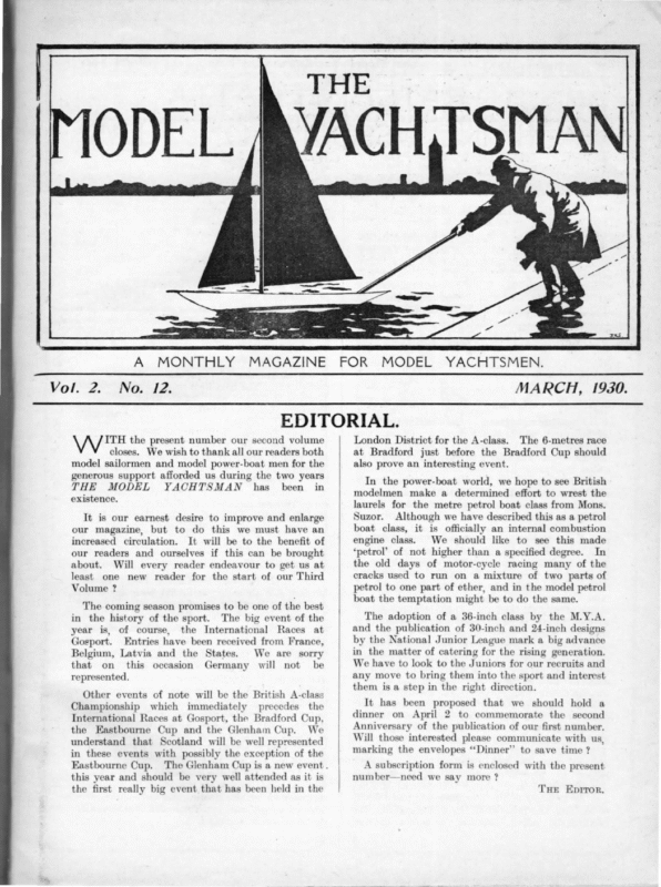 MODEL ,MACH TSEMAN Bs es A Vol. 2. MONTHLY MAGAZINE FOR MODEL YACHTSMEN. MARCH, No. 12. 1930. EDITORIAL. yes the present number our second volume closes. We wish to thank all our readers both model sailormen and model power-boat men for the generous support afforded us during the two years THE MODEL YACHTSMAN has been in existence. It is our earnest desire to improve and enlarge our magazine, but to do this we must have an increased circulation. It will be to the benefit of our readers and ourselves if this can be brought about. Will every reader endeavour to get us at least one new reader for the start of our Third Volume ? The coming season promises to be one of the best the history of the sport. The big event of the year is, of course, the International Races at Gosport. Entries have been received from France, in Belgium, Latvia and the States. We are sorry that on this occasion Germany will not be represented. Other events of note will be the British A-class Championship which immediately precedes the International Races at Gosport, the Bradford Cup, the Eastbourne Cup and the Glenham Cup. We understand that Scotland will be well represented in these events with possibly the exception of the Eastbourne Cup. The Glenham Cup is a new event. this year and should be very well attended as it is the first really big event that has been held in the London District for the A-class. The 6-metres race at Bradford just before the Bradford Cup should also prove an interesting event. In the power-boat world, we hope to see British modelmen make a determined effort to wrest the laurels for the metre petrol boat class from Mons. Suzor. boat Although we have described this as a petrol class, engine class. it is officially an internal combustion We should like to see this made ‘petrol’ of not higher than a specified degree. In the old days of motor-cycle racing many of the cracks used to run on a mixture of two parts of petrol to one part of ether, and in the model petrol boat the temptation might be to do the same. The adoption of a 36-inch class by the M.Y.A. and the publication of 30-inch and 24-inch designs by the National Junior League mark a big advance in the matter of catering for the rising generation. We have to look to the Juniors for our recruits and any move to bring them into the sport and interest them is a step in the right direction. It has been proposed that we should hold a dinner on April 2 to commemorate the second Anniversary of the publication of our first number, Will those interested please communicate with us. marking the envelopes “Dinner” to save time? _ A subscription form is enclosed with the present num ber—need we say more ? THe Eprror. March 1930 ANNUAL GENERAL MEETING. & fie Annual General Meeting of the Model Yachting Association was held on Saturday, January 25, in the Whitefriars Room, Anderton’s Hotel, Fleet Street, London, E.C. The chair was taken by the retiring Chairman, Mr. H. B. Tucker, supported by Mr. C. Stansfeld Hicks, (Vice-President), Mr. A. J. Hugo, (Vice-Chairman), Mr. H. C. Whetstone, (Hon. Treasurer), Mr. C. N. Forge, (Hon. Secretary), Mr. E. E. Marshall, (Trustee), and a goodly gathering of model yachtsmen. Amongst those coming from a distance, we noticed Rev. J. T. Poole, the popular Commodore of the Norfolk and Norwich M.Y.C., Mr. Foster, jnr., son of the able and energetic Hon, Secretary of the Birkenhead M.Y.C., and Mr. EBorkett, Hon. Secretary of the Eastbourne M.Y.C_ The meeting was opened by the Chairman striking six bells and calling on the Secretary to read the Notice convening the Meeting. After the minutes had been read, the Chairman gave his report. He stated that as he had acted in the triple capacity of Chairman to the M.Y.A., Hon. Secretary to the I.M.Y.R.A. and Editor of THE MODEL Y ACHTSMAN, he would give a report of each of these activities. He then proceeded to give a summary of the work accomplished by the Association referring to the progress made, new Clubs that had joined the Association, and the past season’s racing. The racing season had been very satisfactory with the exception that the 18-ftr. and 10-metres events had not been well supported and in some cases fallen through. The prospects for the coming season were good, and the Chairman also referred to the gradual rapprochement and understanding that was coming about between the English and Scottish Clubs. In connection with the I.M.Y.R.A. matters in connection with the B-class were referred to. It was explained that every country had a different idea of what was wanted and all put forward different suggestions. The British proposal that the time was not yet ripe when an agreement could be reached was carried unanimously at the Meeting last August. The first British suggestion of the L. and 8. A. class was again referred to at the August meeting but found no support, but neither did any other proposal. The Chairman then proceeded to give a history of THE MODEL YACHTSMAN and heartily thanked the M.Y.A. and its members for their sunport, and asked them to continue and increase it. In this connection, he particularly called members’ attention to the opportunity of advertising important Club and District Races, and asked Clubs to support the magazine in this way. In the discussion that ensued Mr. A. J. Hugo, who had acted as the other British Representative at the I.M.Y.R.A. Meeting, confirmed Mr. Tucker’s remarks that there was no backing for the British proposition of the L. and S.A. rule, and no hope for the present of any unanimity on the subject of a B-class. The Hon. Treasurer then presented the Balance Sheet and commented on the satisfactory financial position of the Association. The distribution of Cups and prizes: was then carried out. The next item on the Agenda was the Election of Officers and Council which resulted :— President, J.Herbert Scrutton, Esq., Vice-Presidents, Adml. O. F. Gillett, C.B., C. Stansfeld Hicks, Esq., V. Graae, Esq. and