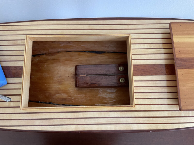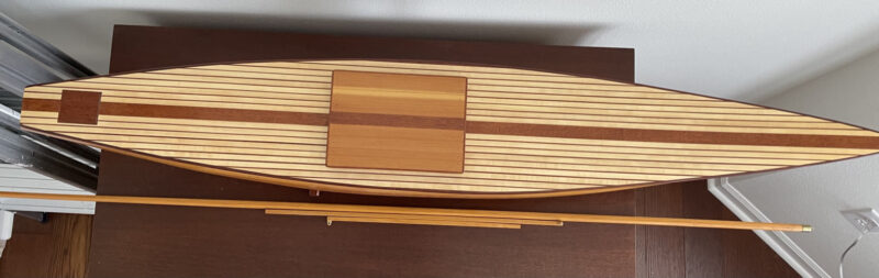 The hull is 48” long, with a 71/2” beam and weighs 10 lbs. It’s waiting for the right person to provide electronics, sails, deck hardware and small other touches to finish the restoration. Dave kept meticulous records of his original purchase and restoration progress. These records will accompany the boat.
