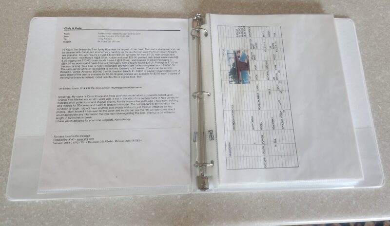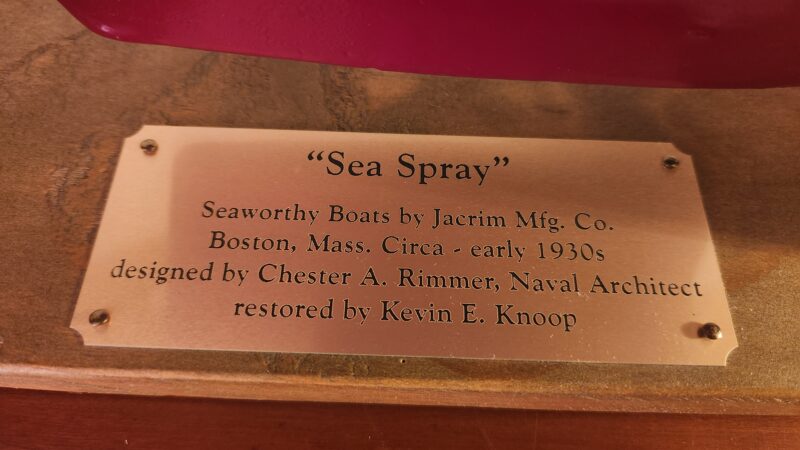 Sea Spray is rigged as a free-sailing yacht, with is a Braine gear mounted on deck.  The original Seaworthy Label is intact and comes with the yacht along with an identification plaque that is attached to the stand.  Included is a binder which details the restoration process for Sea Spray.