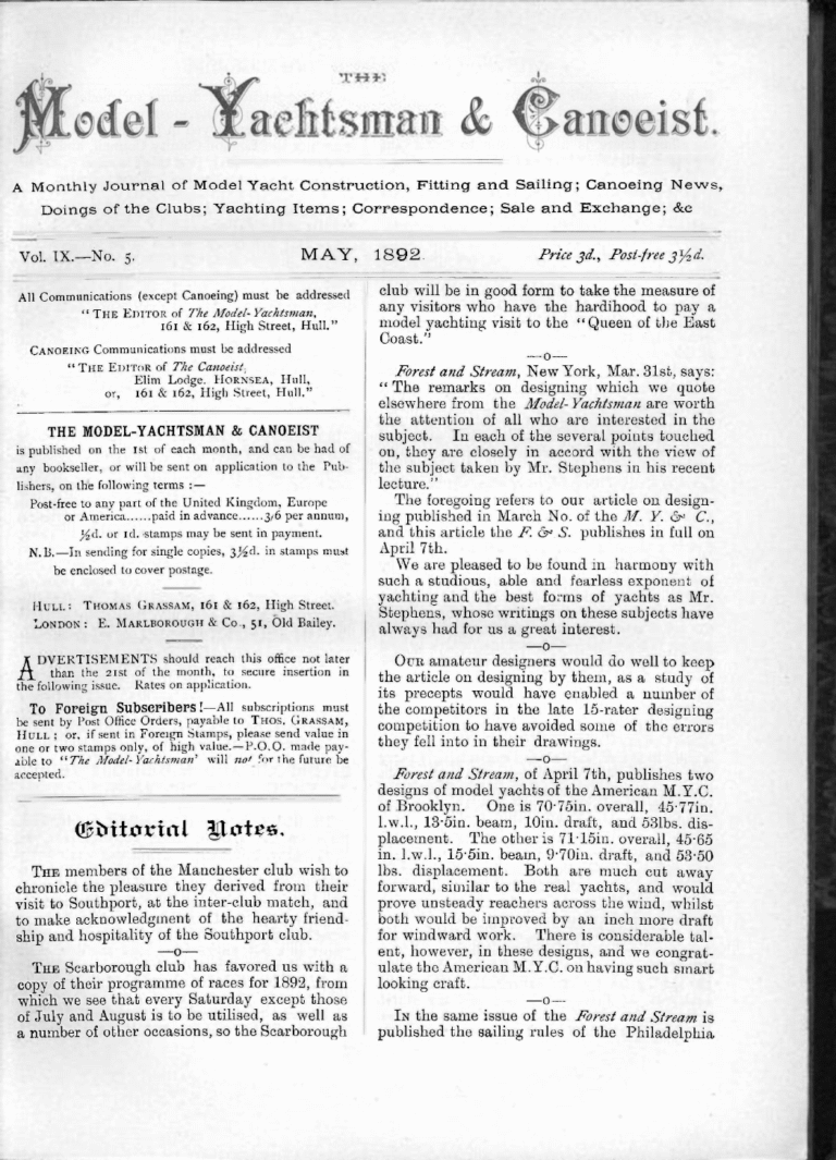 Archives, The Model Yachtsman and CanoeistThe Model Yachtsman and Canoeist: Volume 9, Issue 5 – May 1892May 10, 1892Read MoreThe Model Yachtsman and Canoeist: Volume 9, Issue 5 – May 1892