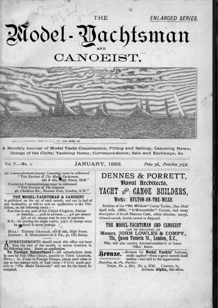 Archives, The Model Yachtsman and CanoeistThe Model Yachtsman and Canoeist: Volume 5, Issue 1 – January 1888January 15, 1888Read MoreThe Model Yachtsman and Canoeist: Volume 5, Issue 1 – January 1888