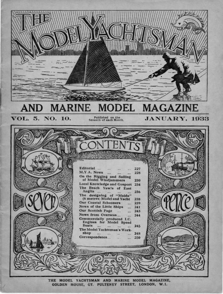 This reprints a series of articles on the design, construction, and sailing of model square-rigged ships. The articles appeared in the British journal The Model Yachtsman and Marine Model magazine from November 1932 to April 1933.