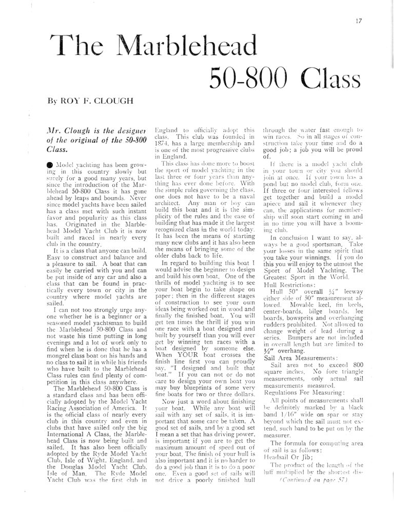 Model yachting has been growing in this country slowly but surely for a good many years, but since the introduction of the Marblehead 50/800 Class it has gone ahead by leaps and bounds.