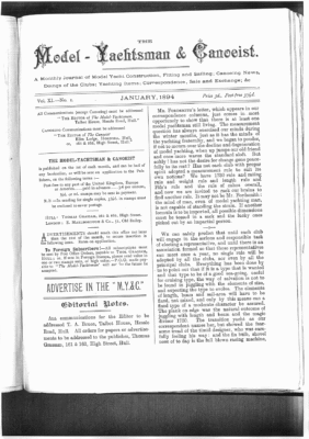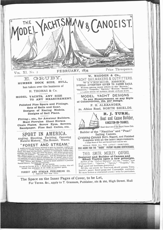 Price Threepence. BRUARY, 1894 ~ Vou. XI, No. 2 W. MADDER & Co., Em GRUBY, VACHT SAILMAKERS & OUTFITTERS. TO ANY MEASUREMENT. Polished Pine Spars and Fittings. Sets of Sails and Gear. Designs of Racing Models. Designs of Sail Plans. A LARGE STOCK OF BAMBOO SPARS T DESIGNS e MODEL YACHeme nt opr any Styl To any Measur of Construction, 15s. per design. F. H. ALEXANDER, 20, Albion Road, NORTH SHIELDS. R. J. TURK, / \ Boat and Canoe Builder, Fittings, ete., for Amateur Builders. Mast Ferrules Sheet Horses. Chain Plates. Serew Eyes. Sandpaper. Fine Sail Calico, ete. ERICA. ~SPORT IN, AM Yachting, Canoeing Shooting Natural History, [SE Serews. The Kennel, Travel. T AND STREAM,” for “FORlES containing sketches o f sport in America—angling weekly journa black bass in the Middle salmon in Canada, trout in the Alleg jhanies, ts of shooting elk, buffalo, deer, 3tates, and tarpo nin the South; acco game; wild turkey, grouse, quail antelope, big-horn, bear, interest for all who enjoy “prairie chickens.” Its pages are full of and the descriptions of sportwell-written papers on travel an a sport; s and are of special value to those ing localities and newly-opened countrie for a permanent home. or pleasure for ca vontemplating a visit to Ameri also gives much attention to practics] The ‘Forest and Stream g. Natural History, Yach ting and Canoein annum. TERMS: £1 per Lane, Cornhill, Lov Forsale by Davies & Co.. 1.ofFinch furnish free catalogues our books on out-door sports. STREAM PUBLISHING CO. FOREST AND 3. Park-row. New York U.S.A -ON-THAMES. KINGSTON— Zs = Head-Quarters of the Royal Canoe Club. s” and ‘‘ Pearl” Builder of the “Nautiluoes . Sailing Can Finished (Cruising Canoes Built, Rigged, andovem ents. _ latest impr Complete with all the Second-hand ones for sale. A Large Stock of New and MEDALS FROM ALL THE LATEST * XHIBITIONS. SOLE AGENT FOR THE “RADIX” PATENT FOLDING CENTREBOARD. THEO. SMITH, MEDLEY, OXFORD, Canoes and Designer and Builder of e. upon a new principl Small Yachtsd Sharpi es” and the “Snake” type Author of the “Oxfor &c. e,” “Torpedo,” of Canoe-Yawl: ‘‘Shacdow,” “Spruc teed. High speed and handiness guaran should possess THEO. All who use screws for woodworkCount ersink combined. and e -gaug Screw patent ’s SmITH for particulars. write ! screws rned overtu or broken No more The Space on the Inner Pages of Cover, to be161Let, Hull For Terms, &c., apply to T. Grassam, Publisher, & 102, High Street, st MODEL YACHTS, ANY SIZE ce,’ ‘Snak ‘Shannon,’ ‘Torpedo,’ ‘Spruce,’ ‘NoviALWA YS KEPT. teow H. THOMAS & Co. EHO, mss mx. WYVEN SAILS. N GIVEN TO CANOE rn,’ SPECIAL ATTENTIO ‘Seve the to s other many g amon rs Make e’ &c, praemenanans HUMBER DOCK SIDE, HULL, has taken over the business of Model – Yaehtsman & Sanoeist. A Monthly Journal of Model Yacht Construction, Fitting and Sailing; Canoeing News Doings of the Clubs: Yachting Items; Correspondence, Sale and Exchange; &c FEBRUARY, 1894 Vol. XI.—No. 2. All Communications (except Canoeing) must be addressed “Tue Epiror of Zhe Alodel- Vachtsman, as we may be able to judge of the number, and whether there will be sufficient to close it by CANOEING Communications must be addressed “THE EpDIToR of Zhe Canoeis¢ Elim Lodge. Hornsea, Hull, or, 161 & 162, High Street, Hull.” February 28th. To our friends, the designers, we would just say afew words. We ask all who can find the time to join in the competition. It is a public service to the cause of Model Yachting, as well THE MODEL-YACHTSMAN & CANOEIST is published on the Ist of each month, and can be had of any bookseller, or will be sent on application to the Publishers; on the following terms :— Post-free to any part of the United Kingdom, Europe or America…… paid in advance…… 3/6 per annum, id. or Id. stamps may be sent in payment. N.B —In sending for single copies, 334d. in stamps must be enclosed to cover postage. THOMAS GRASSAM, 161 & 162, High Street. LONDON: E. MARLBOROUGH & Co., 51, Old Bailey. DVERTISEMENTS should reach this office not later than the 21st of the month, to secure insertion in the following issue. Rates on application. To Foreign Subseribers!—All subscriptions must be sent by Post Office Orders, payable to THOs, GRASSAM, HULL; or, if sent in Foreign Stamps, please send value in one or two stamps only, of high value.—P.O.O. made pay- able to ‘‘7he Model- Yachtsman’ Tue 10-Ratine Desianinc CoMPETITION.— We shall be glad if intending competitors will send us notice of their intention to compete, so Talbot House, Hessle Road, Hull.” HuLL: Price 3a., Post-free 3¥2a. will no/ for the future be accepted. ADVERTISE IN THE © M.Y.&G.” as an encouragement to ourselves, that you should do so. The participation should be as general and as wide as possible. We the writers give all our labors gratis, and the publishers make no profit. It is done willingly for the benefit of the sport, and we therefore hope that our friends will not grudge the trouble involved in making a design for these annual competitions. We desire to make a respectable show before the judge, and let it be borne in mind that the judges’ remaiks on the designs are of the greatest interest and instruction to Model Yachting readers, far and wide. So-don’t be backward in helping us in these matters. We shall be glad of any further subscriptions or gifts towards the prizes. Several correspondents ask if more than one design from each competitor will be permitted, This is a point that did not make itself present in our mind when formulating the conditions, and, as itis raised too late to give fair notice with satisfaction to everybody, it will be best that only one design from each competitor be sent. In our next competition we will carefully consider the advisability of allowing amateurs to contribute more than one, if they think fit. —o— Goditorial _ALL communications Totes. for the Editor to be ad